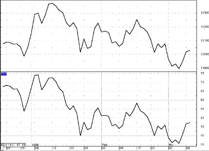 - FIGURE 2: CLOSING PRICE AND RELATIVE STRENGTH INDEX. Here’s the March T-bond contract with a 14-period relative strength indicator (RSI) plotted below. The normalization step in the RSI calculation creates a range of values between zero and 100, effectively restricting the values. The RSI mimics the closing price. Any indicator that uses the closing price is a filter of the daily bar’s activity.