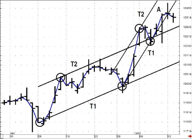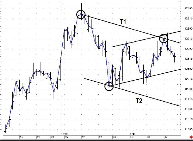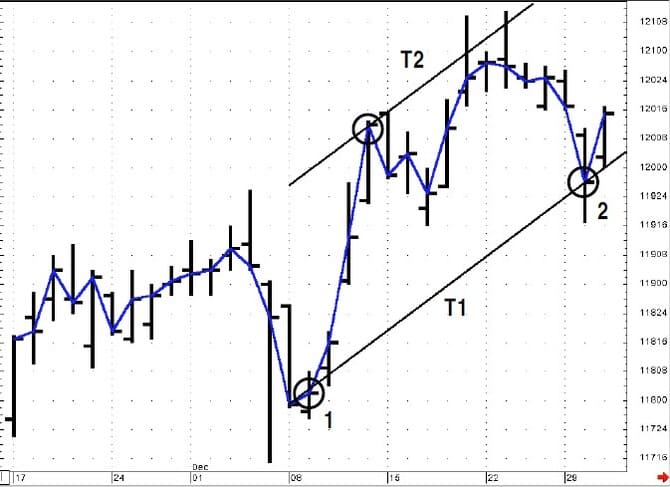 - FIGURE 4: TRENDLINES. Trendline 1 (T1) is the closing price of 118-02 on December 9 to the closing price of 119-28 on December 30. Each closing price is circled. Trendline 2 (T2) is the closing price of 119-28 on December 30 to the closing price of 122-08 on January 7. The break of T2 seems to forewarn of the test of T1, which was also subsequently broken.