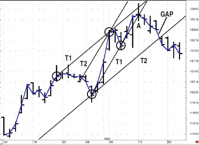 - FIGURE 5: TREND CHANNELS. This is the first half of Figure 4. The line labeled T1 is a support line drawn along points 1 and 2; next, draw a line parallel to this support line using the high closing price between the two support points that is the maximum width from the support line. Exceeding the resistance line is evidence of a great deal of demand. Likewise, the failure to reach this upper line may warn of near-term weakness.