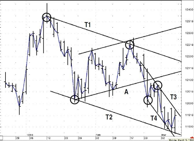 - FIGURE 12: MAJOR SUPPORT. The selling pressure pushed the market right through the support level (A) established off of the low points established in late January and early February. When the market broke the lows of January 23, it immediately retraced but did not close or trade above the support line shown along the bottom of Figure 9. Then the market reached the support level of the downward trend channel defined by lines T1 and T2 in Figure 12. The decline from February 18 to March 6 created a new downward trend channel (T3 and T4).