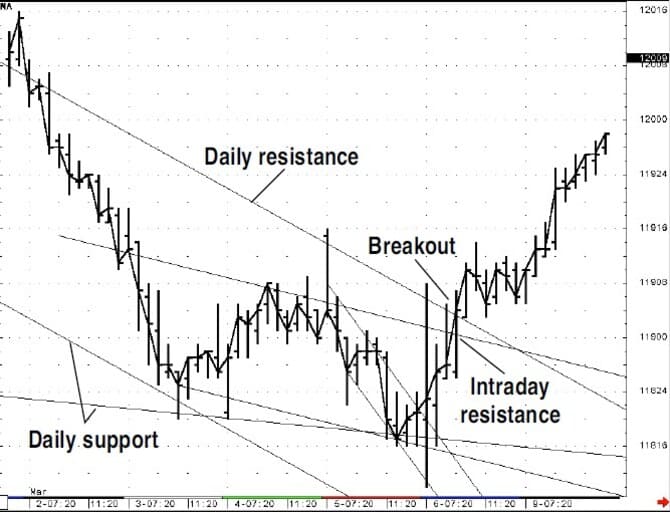 - FIGURE 25: MULTIPLE TIME FRAMES. The dynamic trio, based on the daily bars, can be shown on the chart of the 40-minute bars. Both support lines for the daily and 40-minute dynamic trio are taken out at nearly the same level on February 23. On February 24, the market continues lower, tracked by the 40-minute dynamic trio.