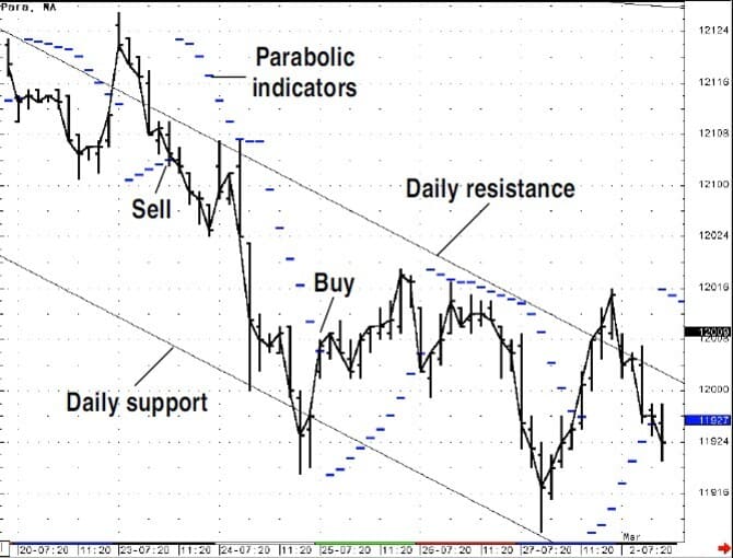 - FIGURE 18: JUNE T-BONDS. Here, the parabolic indicator is applied to the 40-minute bars along with the daily channel support and resistance lines. The parabolic indicator is a stop-and-reverse indicator and automatically adjusts a trailing stop based on the market action.