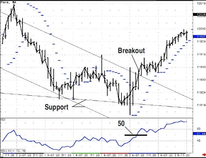 - FIGURE 21: JUNE T-BONDS. Here’s an example of how these various indicators interplay. You could have bought if support held and the RSI moved above 50. The parabolic could be used as a trailing stop. Now, our intraday method is a combina-tion of key price levels, momentum and trend.